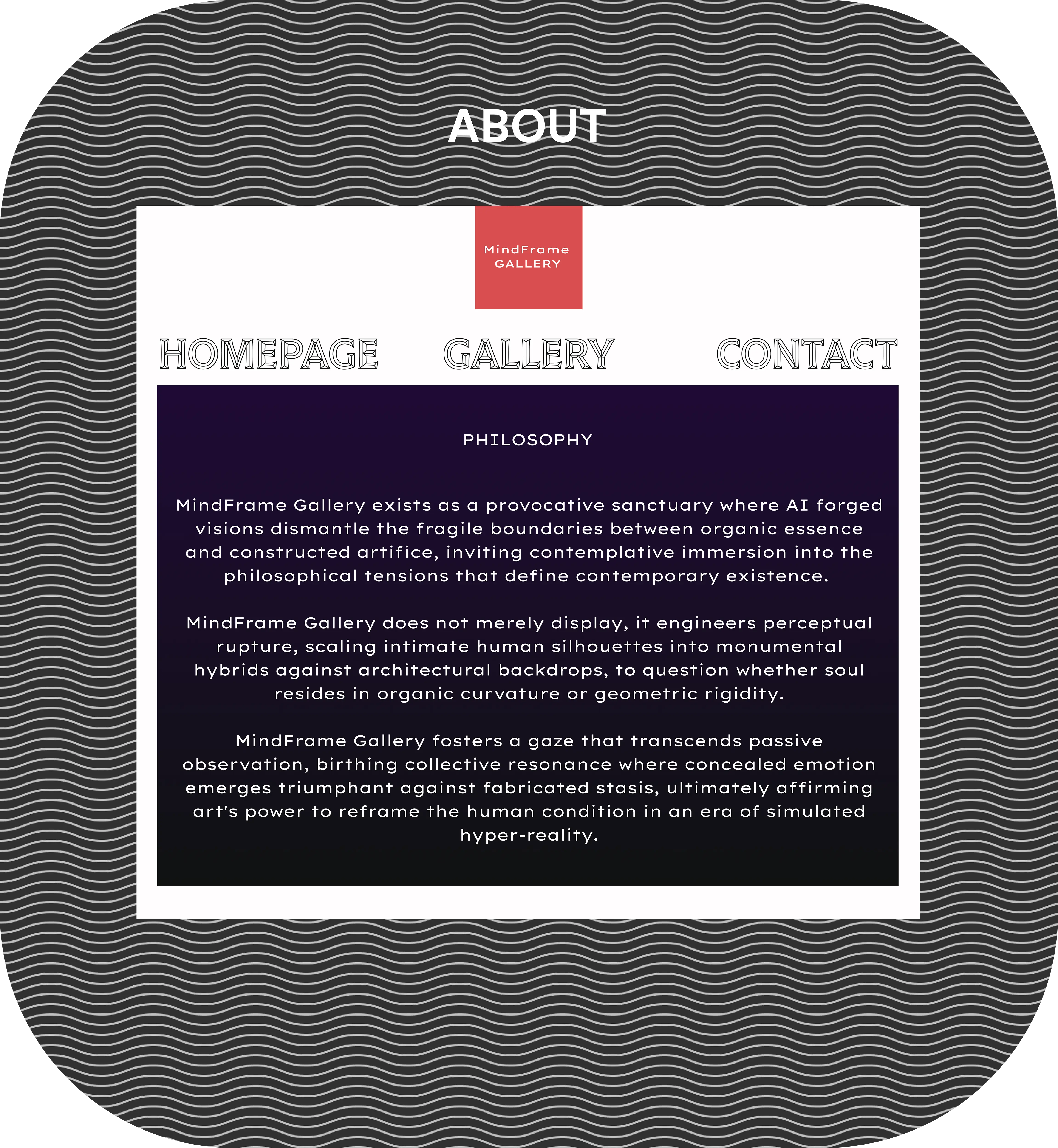 MindFrame Gallery's website, evoking intellectual intrigue and effortless immersion that aligns perfectly with the "mind frame" concept.