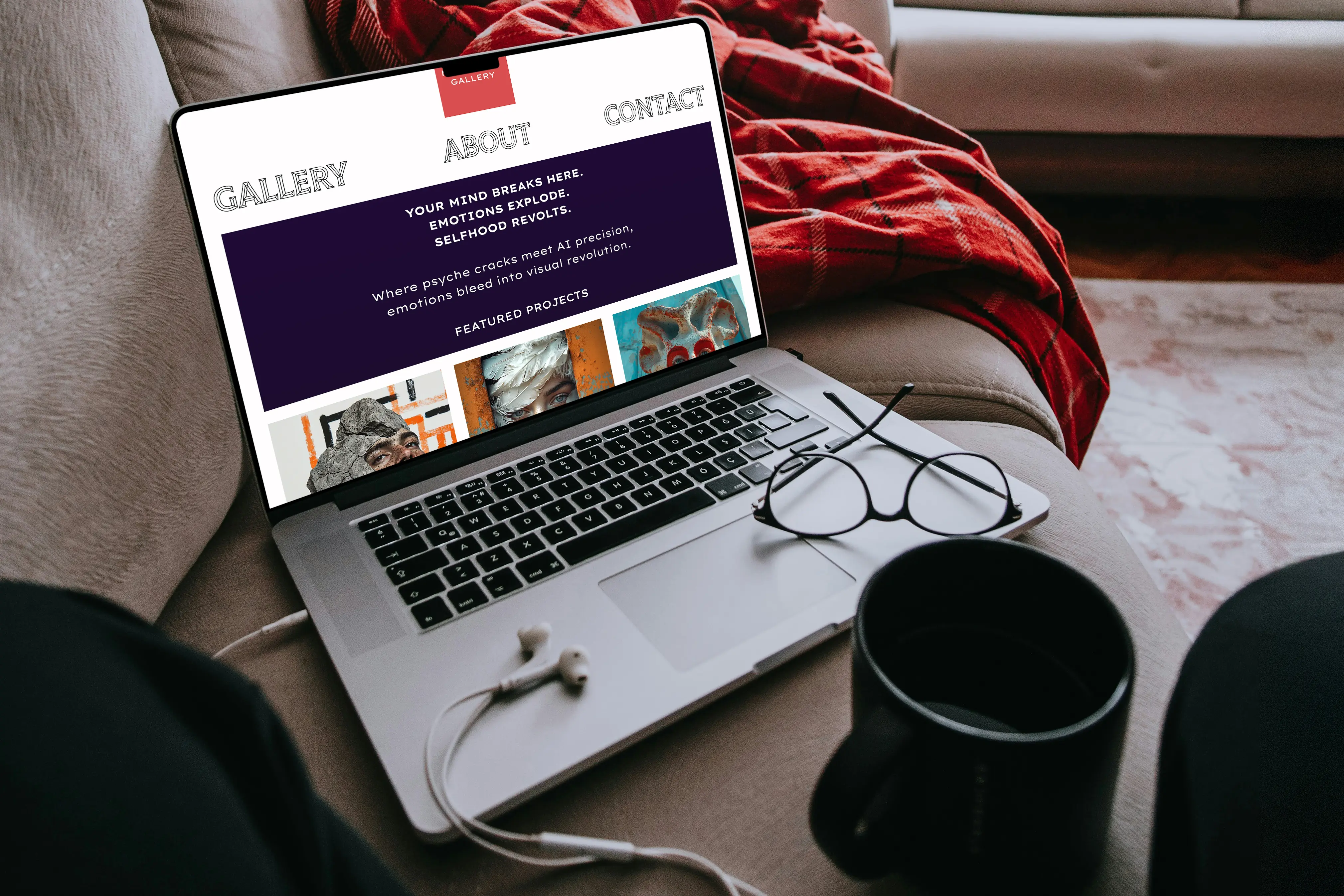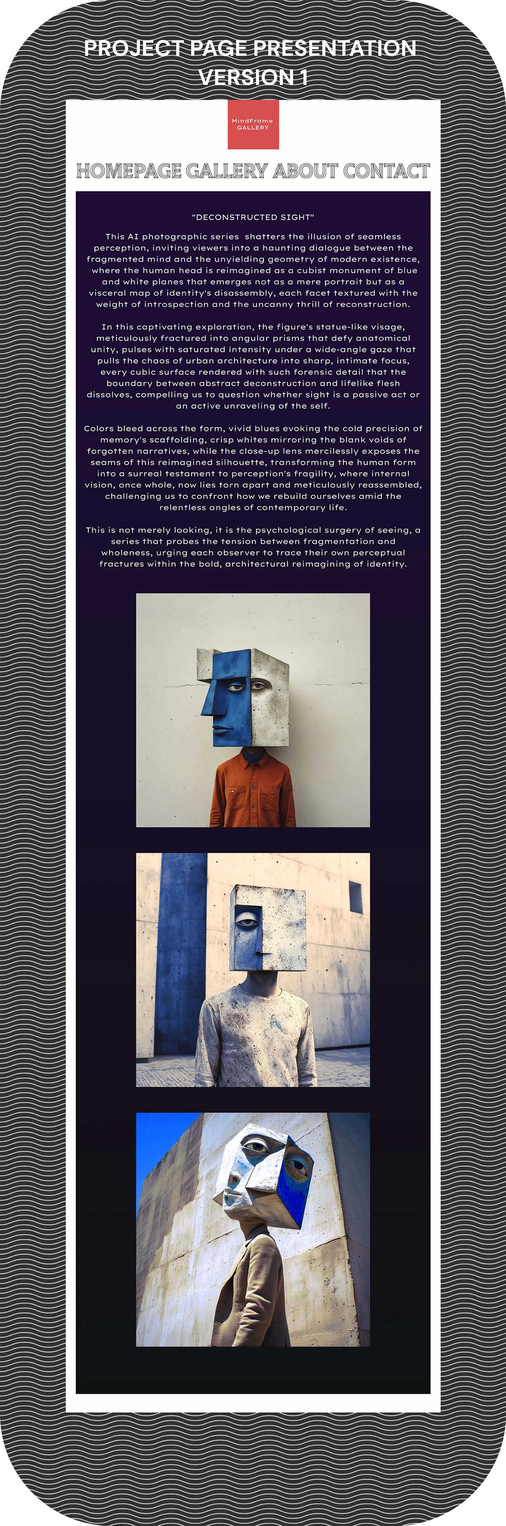 High-fidelity mockups for MindFrame Gallery's web were crafted iteratively , blending psychological user personas with prismatic distortions to simulate "mind frame" perceptual shifts right from the prototype stage.