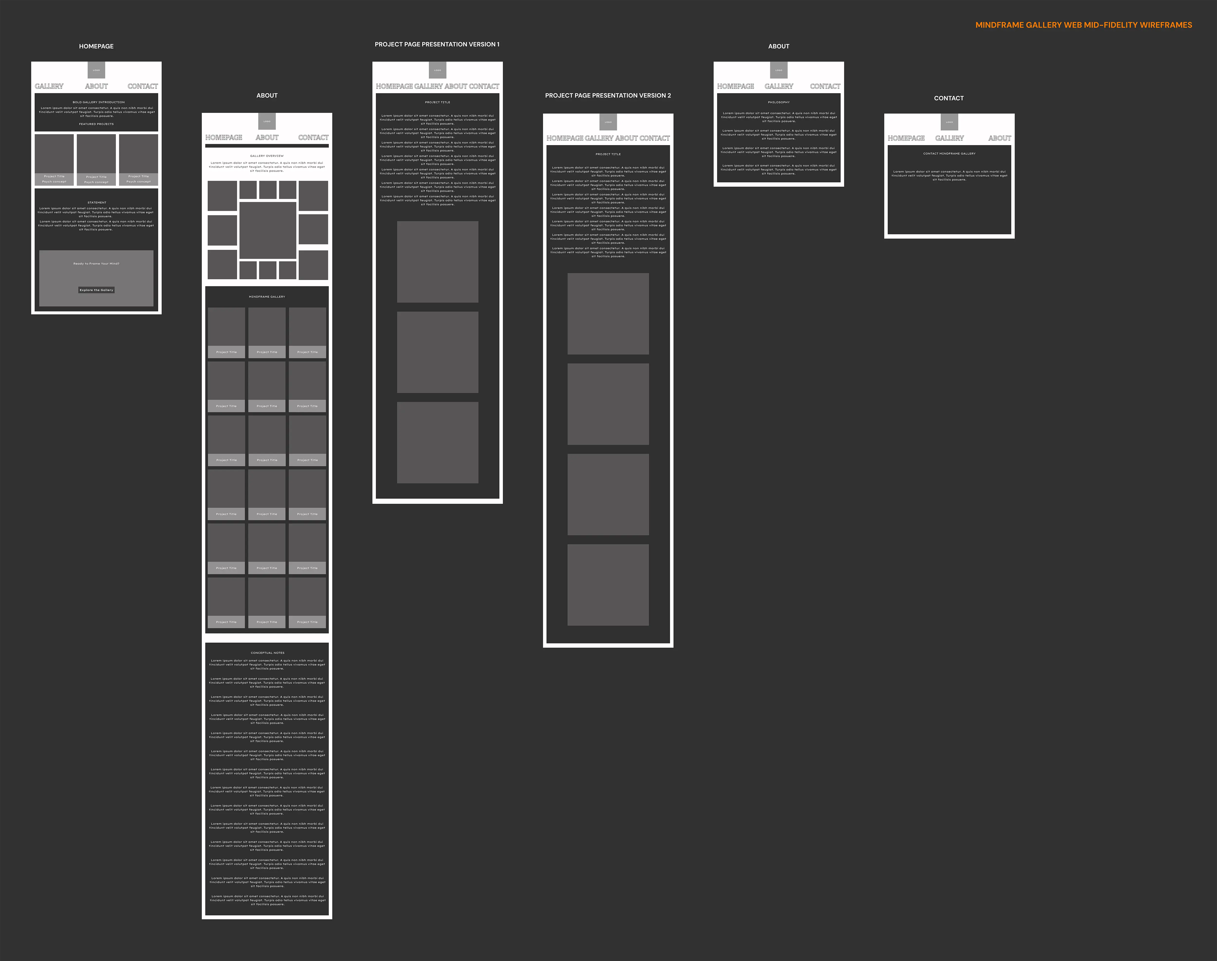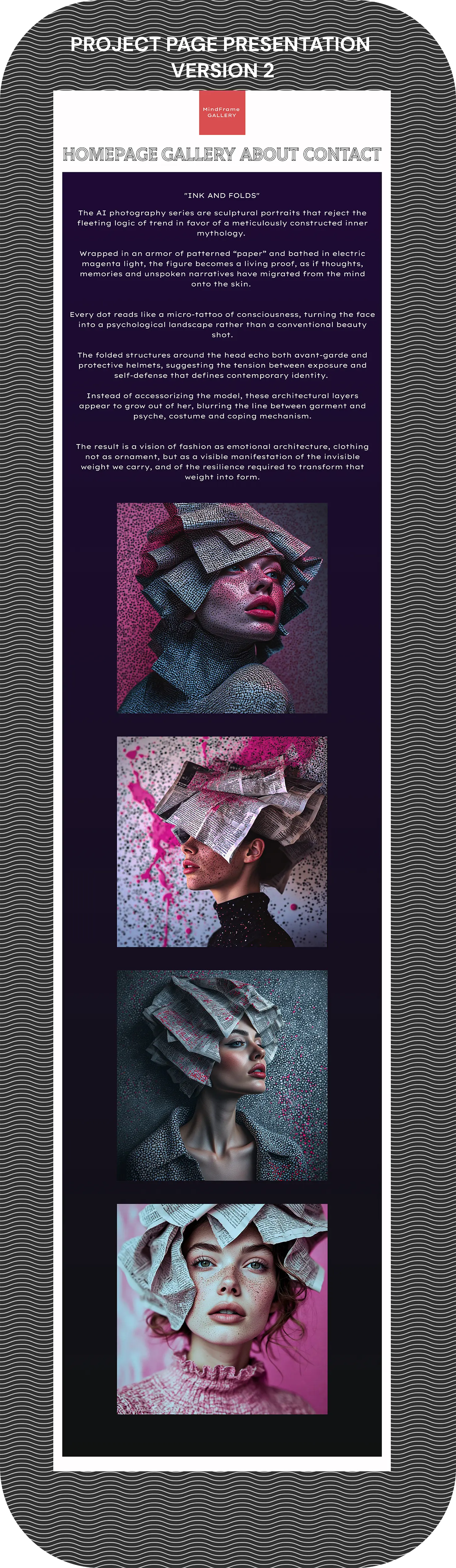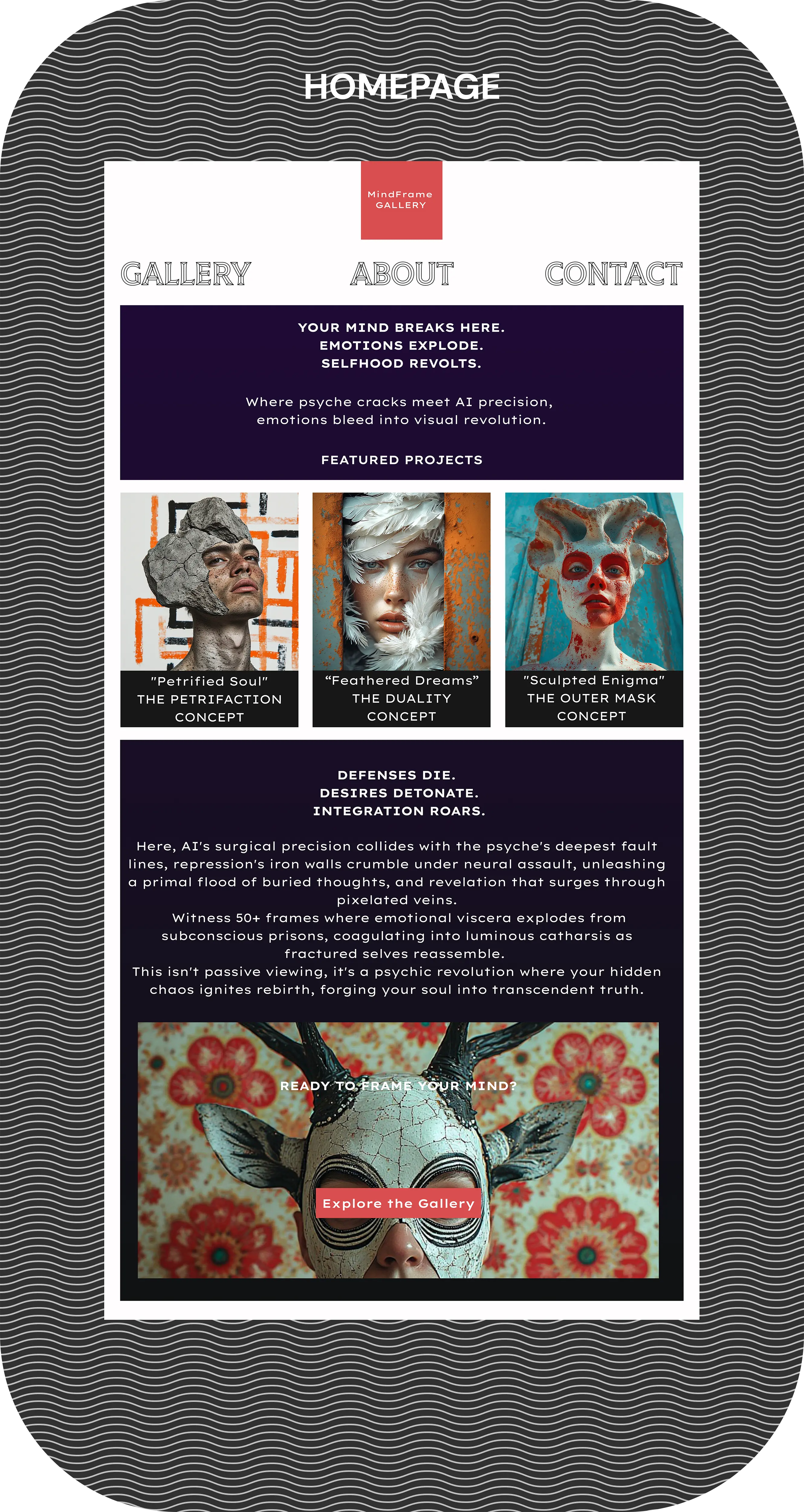 High-fidelity mockups for MindFrame Gallery's web were crafted iteratively , blending psychological user personas with