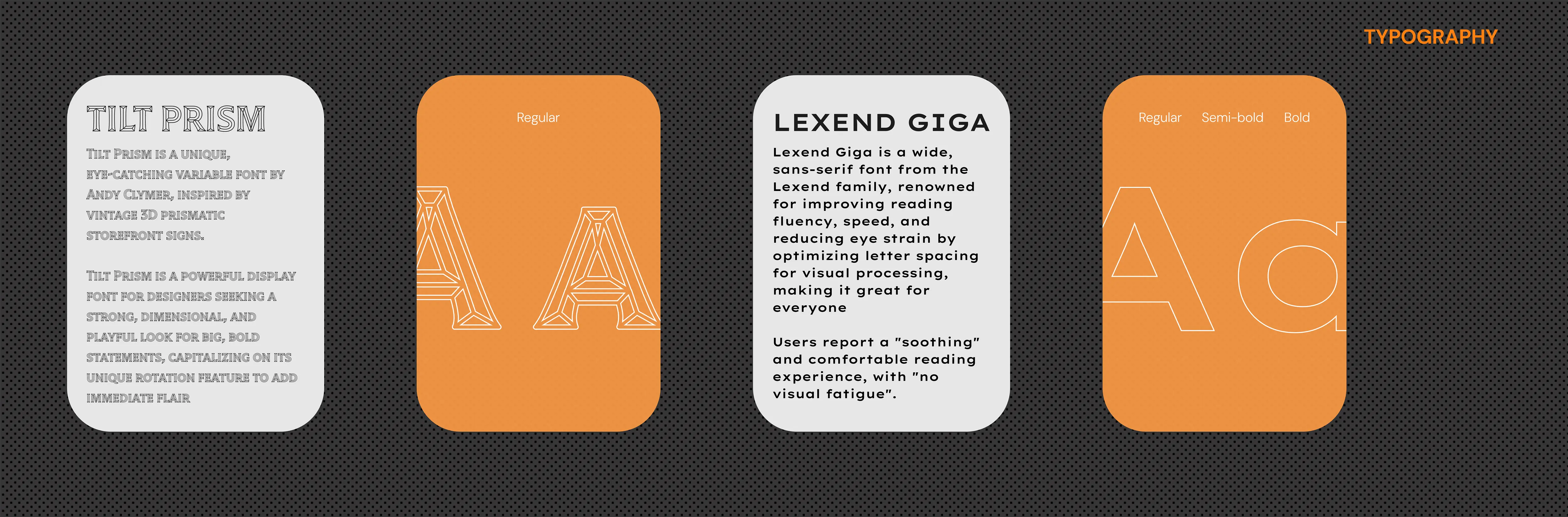 TILT PRISM for paired with LEXEND GIGA creates a dynamic, psychologically attuned typographic hierarchy on